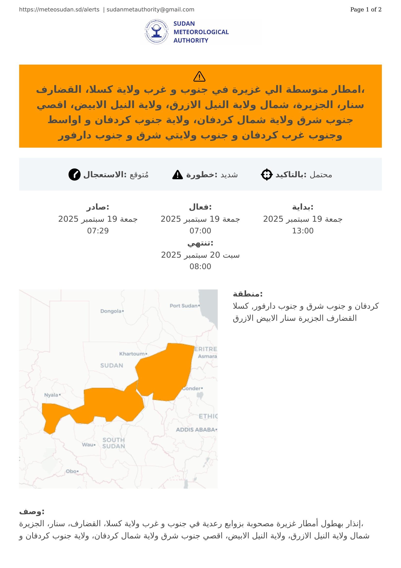 أمطار متوسطة الي غزيرة في جنوب و غرب ولاية كسلا، القضارف، سنار، الجزيرة، شمال ولاية النيل الازرق، ولاية النيل الابيض، اقصي جنوب شرق ولاية شمال كردفا(19/09/2025)