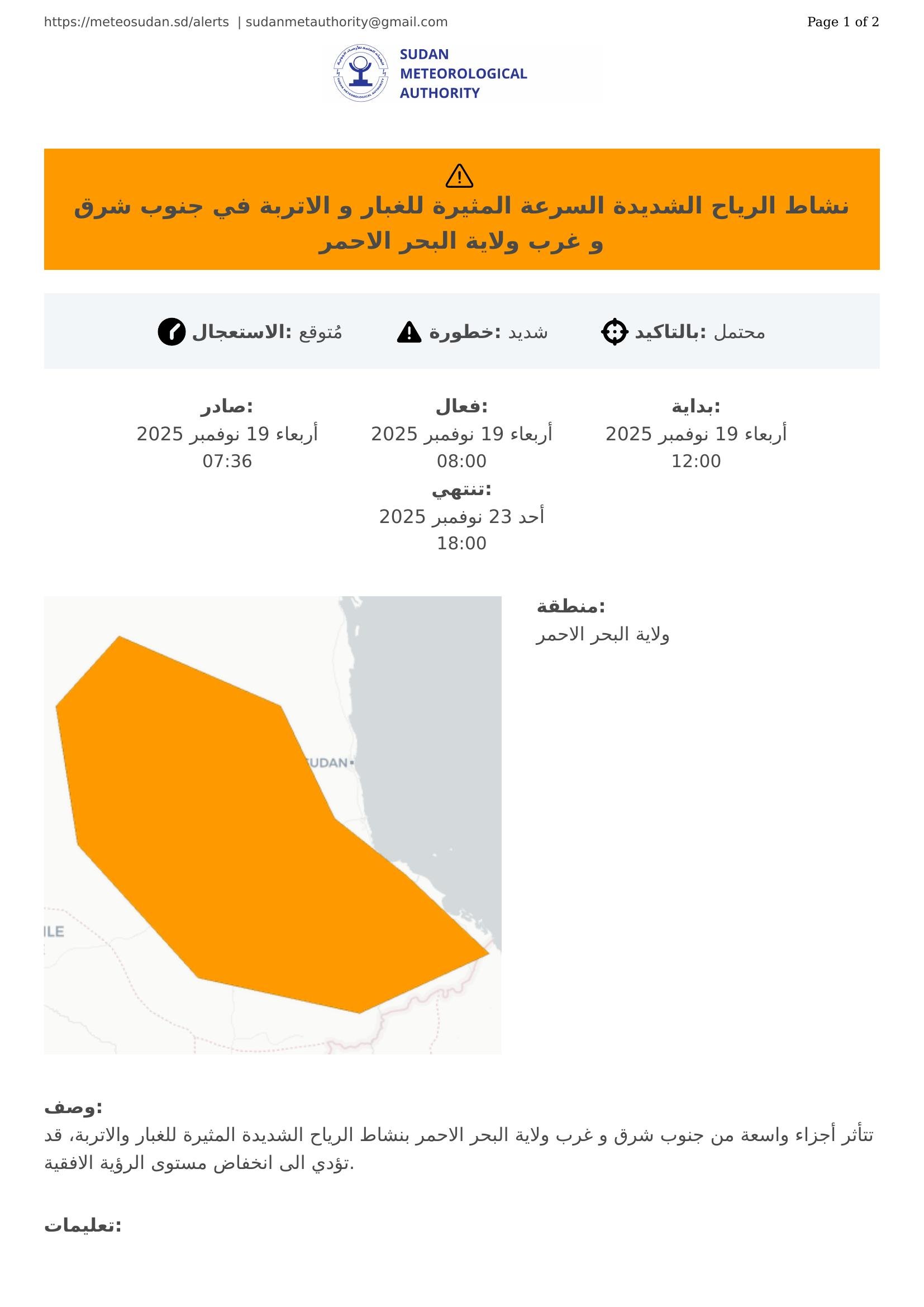 تتأثر أجزاء واسعة من جنوب شرق و غرب ولاية البحر الاحمر بنشاط الرياح الشديدة المثيرة للغبار والاتربة، قد تؤدي الى انخفاض مستوى الرؤية الافقية.