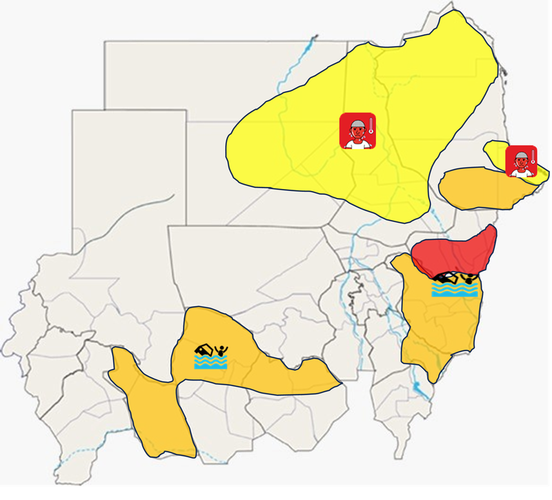 - عواصف رعدية وأمطار غزيرة الي غزيرة جداً متوقعة في شرق وجنوب كسلا جنوب البحر الأحمر، القضارف، شرق سنار، شمال ولايتي جنوب وغرب كردفان وشرق دارفور (في الفترة المسائية حتى صباح الغد) وأمطار خفيفة الي متوسطة في جنوب شرق، وسط، جنوب وغرب البلاد.