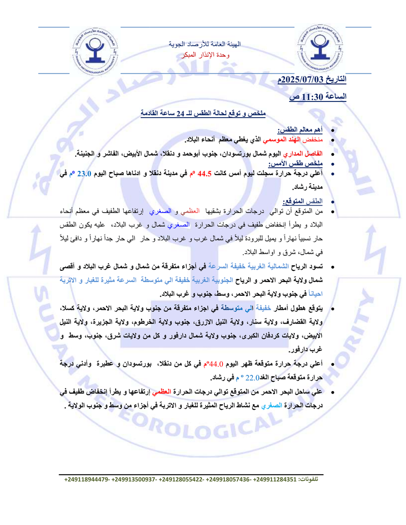 - أعلى درجة حرارة متوقعة ظهر اليوم: 44.0°م في دنقلا، بورتسودان، وعطبرة.