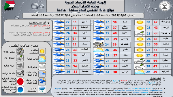 - أعلى درجة حرارة متوقعة ظهر اليوم: 44.0°م في دنقلا، بورتسودان، وعطبرة.