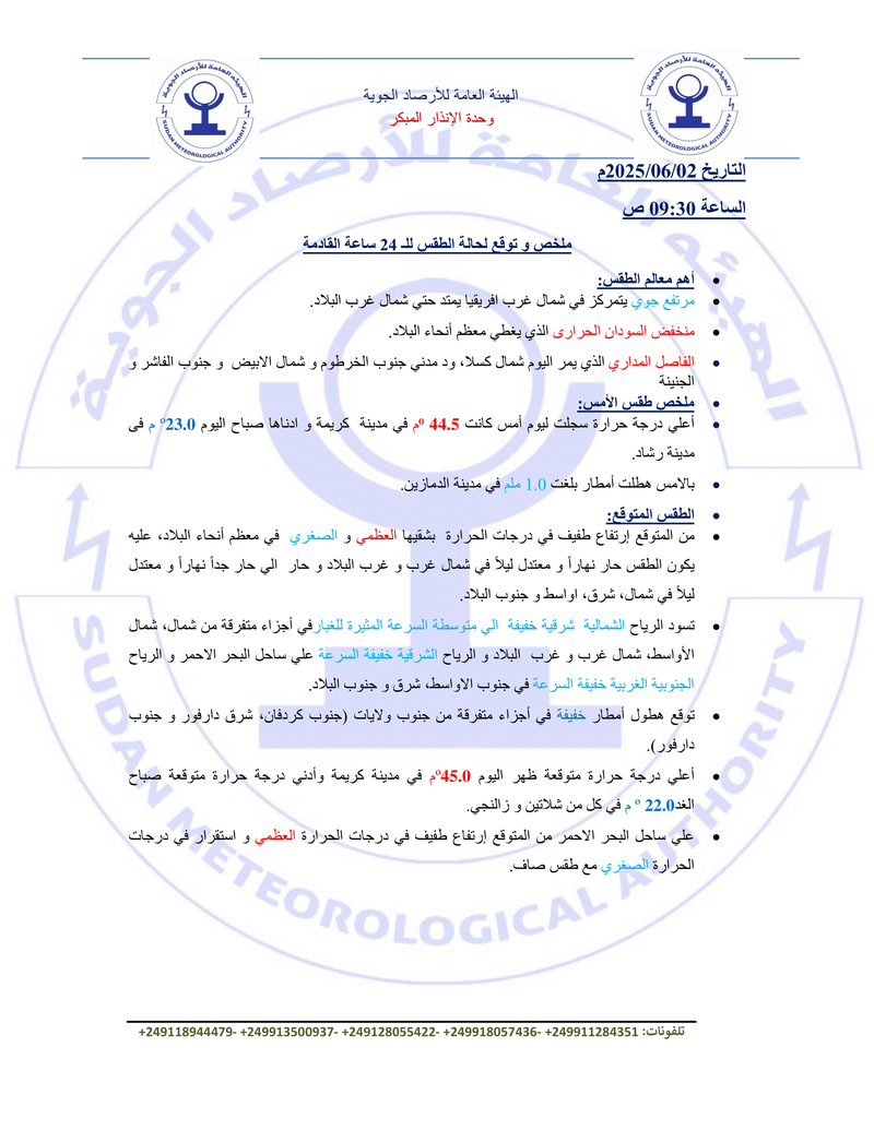 - من المتوقع إرتفاع طفيف في درجات الحرارة بشقيها العظمي و الصغري في معظم أنحاء البلاد، عليه يكون الطقس حار نهاراً و معتدل ليلاً في شمال غرب و غرب البلاد و حار الي حار جداً نهاراً و معتدل ليلاً في شمال، شرق، اواسط و جنوب البلاد.