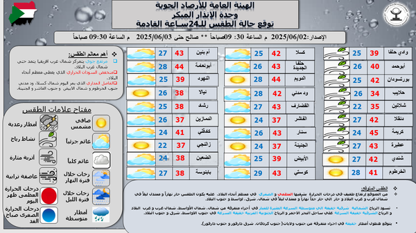 - من المتوقع إرتفاع طفيف في درجات الحرارة بشقيها العظمي و الصغري في معظم أنحاء البلاد، عليه يكون الطقس حار نهاراً و معتدل ليلاً في شمال غرب و غرب البلاد و حار الي حار جداً نهاراً و معتدل ليلاً في شمال، شرق، اواسط و جنوب البلاد.