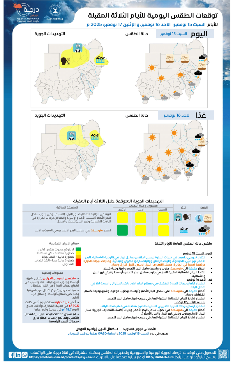 🌡️ ارتفاع تدريجي طفيف في درجات الحرارة ليصبح الطقس معتدل نهارا في (الولاية الشمالية، البحر الاحمر، نهر النيل، الخرطوم، ولايات كردفان وولايات دارفور الكبرى وبارد ليلاً، ومازالت درجات الحرارة مرتفعة نسبياً في الجزيرة، كسلا، القضارف، النيل الابيض، النيل الازرق وسنار.