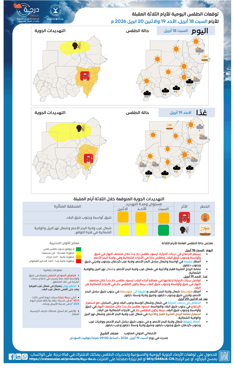 🌡️ يستمر الارتفاع في درجات الحرارة، ليسود طقس حار جداً خلال منتصف النهار في شرق وأواسط وجنوب شرق البلاد، وطقس حاراً في الأجزاء الشمالية وفي ولاية البحر الأحمر.