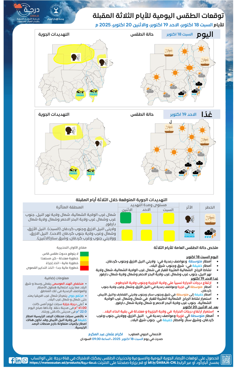 توقعات احوال الطقس اليومية في الفترة من (18-20) اكتوبر 2025 م