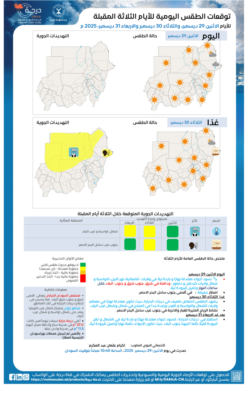 🌡️ تسود أجواء معتدلة نهارًا و باردة ليلاً في ولايات الشمالية، نهر النيل، الاواسط و شمال ولايات كردفان و دارفور ، ودافئة في شرق، جنوب شرق و جنوب البلاد خلال ساعات النهار وتميل للبرودة ليلاً.