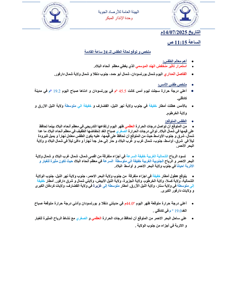 - أعلى درجة حرارة ظهر اليوم: 44.0°م في دنقلا وبورتسودان