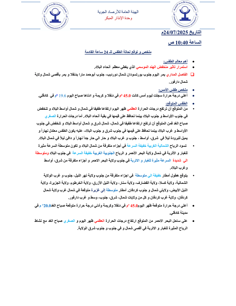 🌡️ أعلى حرارة متوقعة اليوم: 45.0°م (دنقلا، كريمة)