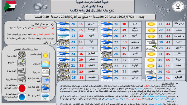 🌡️ أعلى حرارة متوقعة اليوم: 45.0°م (دنقلا، كريمة)