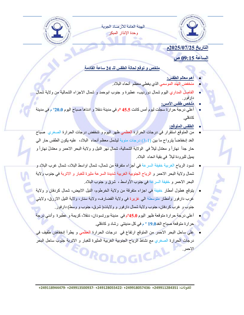 - 🌡️ أعلى درجة حرارة: 45.5°م في مدينة دنقلا