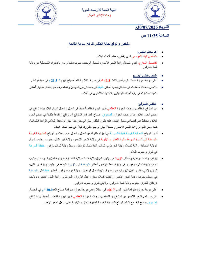 - 🔥 أعلى حرارة اليوم: 46.0°C في دنقلا