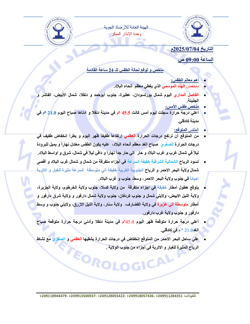 - أعلى درجة حرارة سُجلت يوم أمس: 45.5°م في دنقلا.