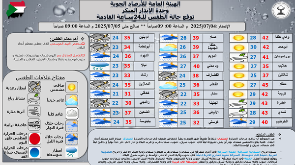 - أعلى درجة حرارة متوقعة ظهر اليوم: 45.0°م في دنقلا.