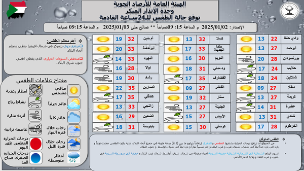 - تسود الرياح الشمالية الي الشمالية الشرقية خفيفة السرعة اجزاء متفرقة من شمال، شرق، أواسط، جنوب و شمال غرب البلاد و خفيفة الي متوسطة السرعة في جنوب و غرب البلاد و ولاية البحر الأحمر.
