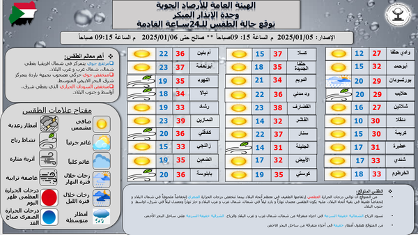 - أعلي درجة حرارة متوقعة ظهراليوم 39.0ºم في مدينة الدمازين وأدني درجة حرارة متوقعة صباح الغد10.0 º م في مدينة دنقلا.