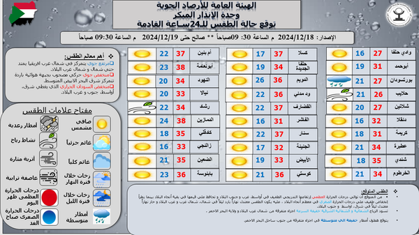 - أعلي درجة حرارة متوقعة ظهراليوم 38.0ºم في مدينتي ابو نعامة و الدمازين وأدني درجة حرارة متوقعة صباح الغد16.0 º م في كل من وادي حلفا، دنقلا والفاشر.