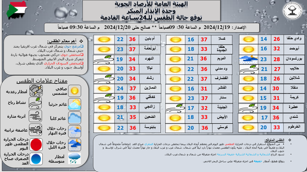 - أعلي درجة حرارة متوقعة ظهراليوم 37.0ºم في كل من كسلا، القضارف، سنار، ابو نعامة و الدمازين وأدني درجة حرارة متوقعة صباح الغد14.0 º م في مدينتي وادي حلفا و دنقلا.