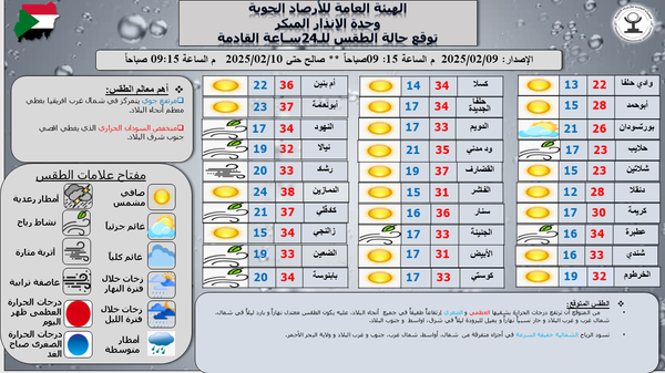 - أعلي درجة حرارة متوقعة ظهراليوم 38.0ºم في مدينة الدمازين وأدني درجة حرارة متوقعة صباح الغد12.0 º م في مدينة دنقلا.
