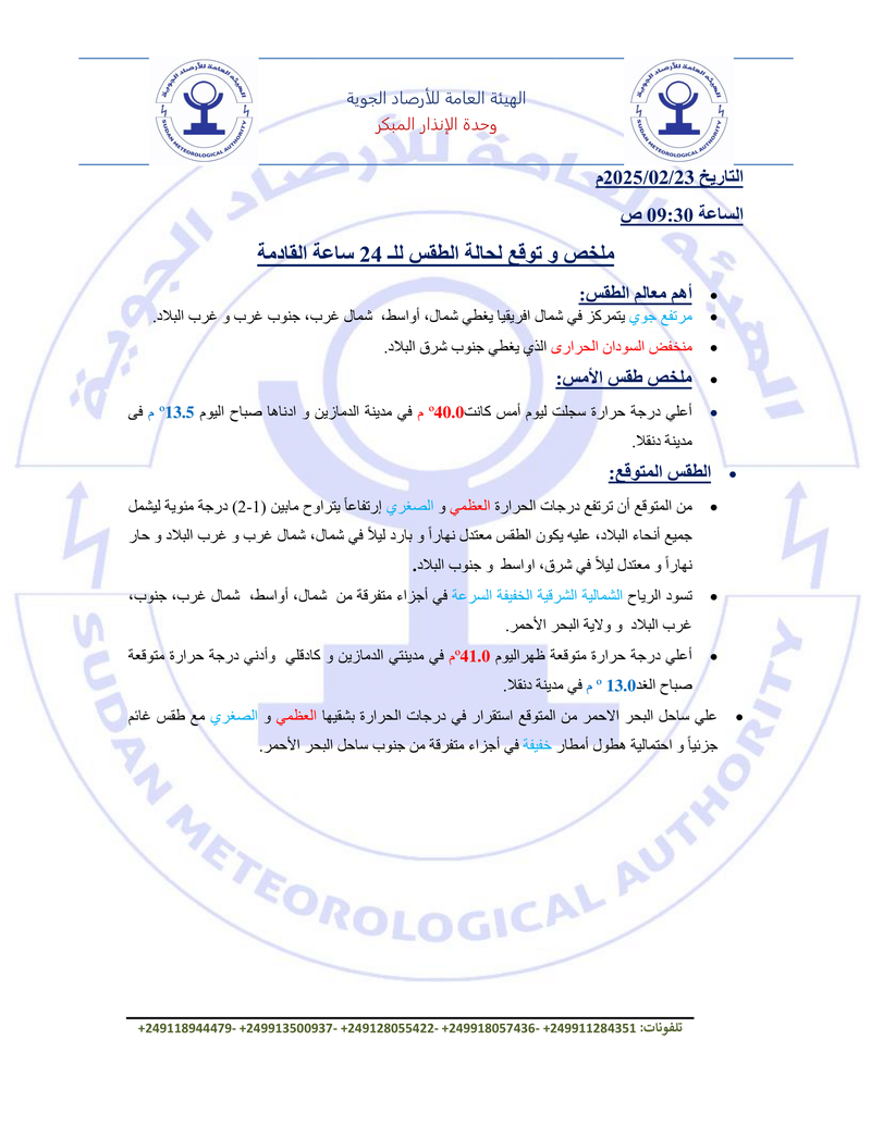 - أعلي درجة حرارة سجلت ليوم أمس كانت40.0º م في مدينة الدمازين و ادناها صباح اليوم 13.5º م فى مدينة دنقلا.
