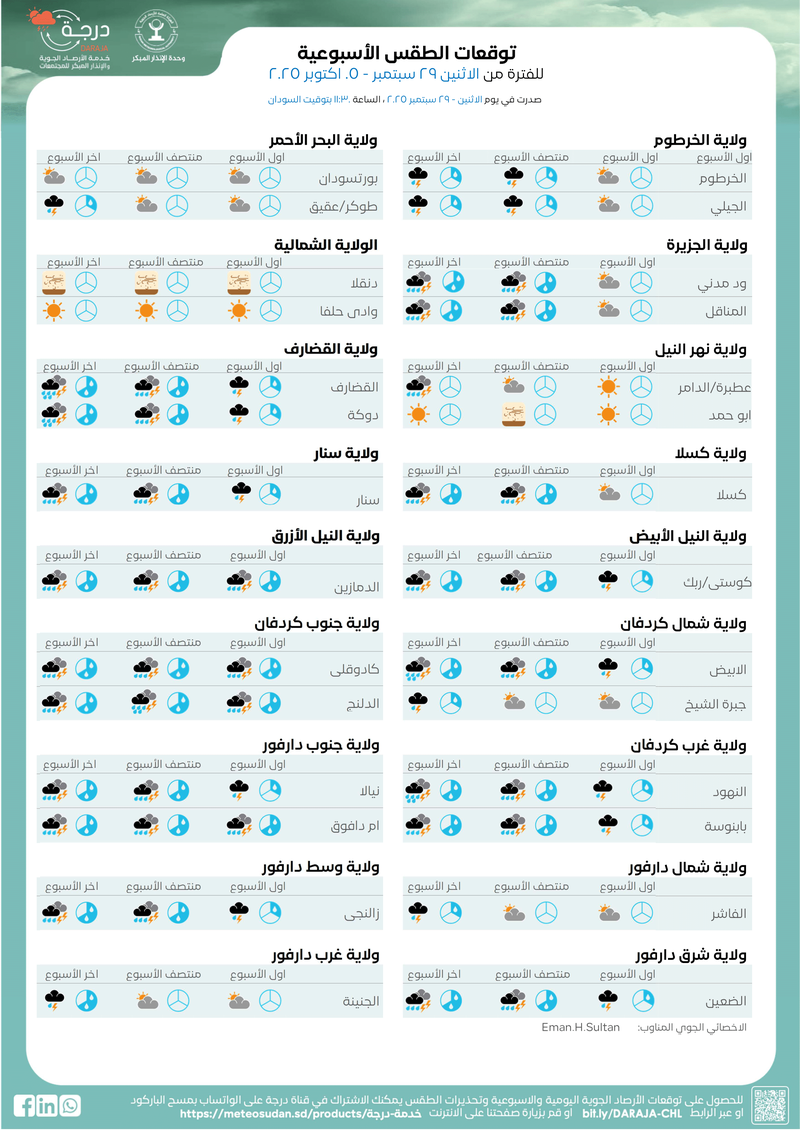 توقعات الطقس الاسبوعية في الفترة من 29 سبتمبر -05 اكتوبر 2025 م